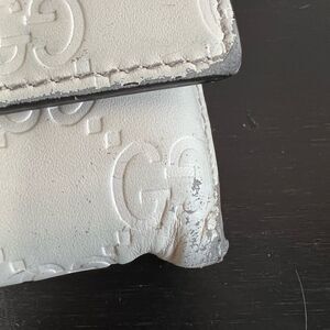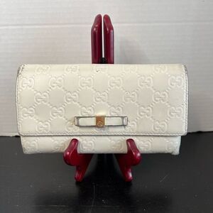 This is preowned obviously used .Slightly dirty,some color of.Many compartments.Credit cards slips,zipper compartment.Numbered!Check pictures for details.The color is off white/ very light cream