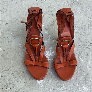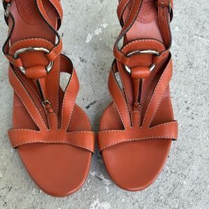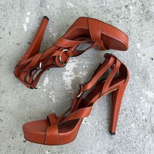 Check out the pictures the leather has no damage, but I show in pictures that the backside heel needs to have a touch of color. The color is a rusty orange. Platform height is 1 inch heel height is 5 inches.