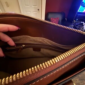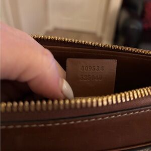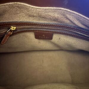 Elegant Gucci bag with soft tan suede interior. Features a sleek zipper closure.