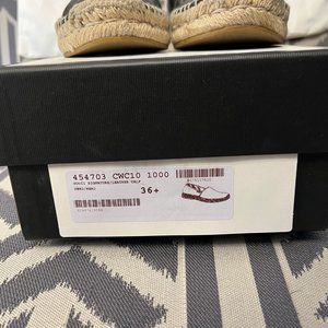 Gucci leather espadrille with monogram. Size 36. I probably wore these 3 times. I'm a traditional size 6 in US sizing and these fit fine. Comes with original Gucci box, both Gucci shoe dust bags.