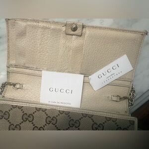 Gucci classic monogram with ivory leather trim and gold chain. Can be used as wallet or going out bag.