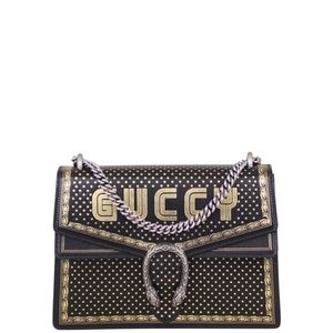 Rare peace, Limited collection Black and gold-tone leather medium Guccy Dionysus shoulder bag from Gucci featuring a silver-tone chain shoulder strap, a fold over top with magnetic closure, multiple interior compartments and an interior zipped compartment. Made in Italy. Outer: Leather 100%, Lining: Silk 100%. Serial number inside of the bag: 4002350-520931