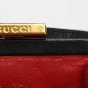 Stamped gucci inside, the gold toned snap closure hardware also stamped Gucci,with a long flat strap, the interior red leather lined.