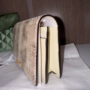 Elevate your style with the Gucci python chain wallet, showcasing a luxurious python texture that exudes sophistication. This elegant accessory features a structured design complemented by a gold-toned chain strap, perfect for adding a touch of glamour to any ensemble. The iconic Gucci branding subtly enhances its timeless appeal.