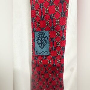 Gucci necktie. Logo lining, logo print on skinny outside. Red chain horsebit print. Very good condition.