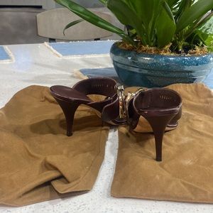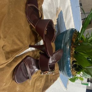 Burgundy leather with light shiny horsebilt buckle. Authentic brand but I no longer have the box. I do have the dust covers. There is no damage to the leather.