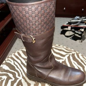Excellent condition. Genuine shearling lining. Logo embossed leather uppers. Track soles. Warm and fabulous. Comes on box. These are 6C.