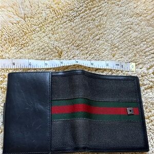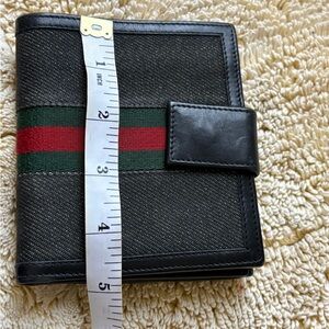 Gucci sherry line small wallet that really packs a punch. Holds a lot of your cards and money for such a petite cutie. In great used condition. Some scuffs/scratches on the leather. Canvas and sherry line look great. Snap closures are snappy. Please view all photos before purchasing.