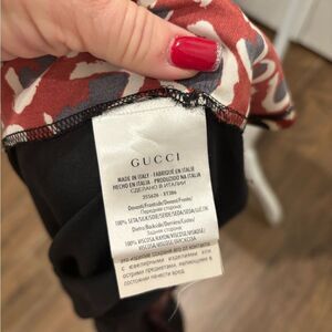 Beautiful red and black Gucci gently worn leopard print shirt. Top half is solid black bottom half is leopard print. Size Medium. Fits size 8-12 approximately. Front of shirt is silk and back of shirt is lightweight cotton I believe. See care instructions in photo. Comes from smoke free home. No rips holes or tears or snags. Excellent condition.