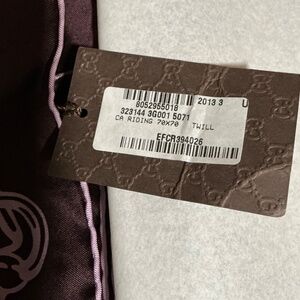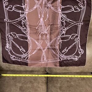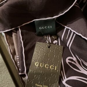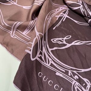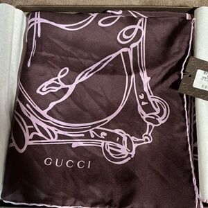 Gucci silk scarf. 70x70 cm size. New with tags. Never worn. Brown and dusty rose with pink accents..
