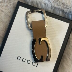 Gucci silver/goldtone keychain with tan leather strap. Preowned and great condition with tiny minor scratches only. The G logo looks to be a little gold tone with the square attachment looks to be more silver. Leather looks good with no major cracks or stains.