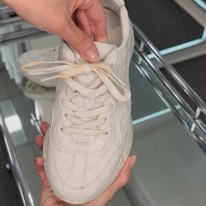 White coated canvas with signature Gucci logo pattern in light grey, chunky rubber white sole, low-top, lace-up