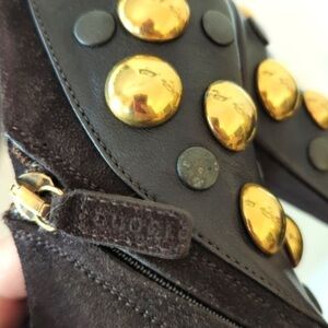 Gucci studded suede leather winter booties gold and leather stud detailing round toe 4" heel 1/4" covered platform Condition: Good with light wear around bottoms. See pics for close ups. These originally retailed for over $1000! Feel free to ask me anything or make an offer.