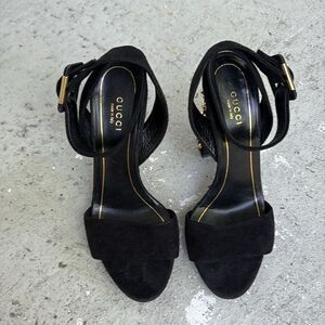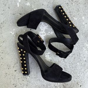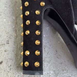 These are absolutely beautiful shoes, but please look at the pictures on the inside of the right shoe heel is missing one stud. Could be replaced, but is barely noticeable when wearing. Heel height is almost 5 inches.