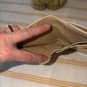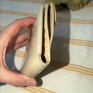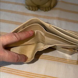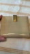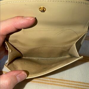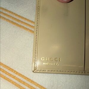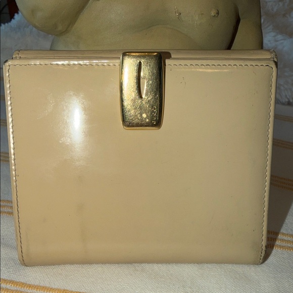 This is a Gucci vintage patent leather tan wallet with a gold clasp. The wallet does have some color transfer and wear on one corner. There is some coin residue in the back coin area. This wallet can hold eight cards and has two bill holders. The Gucci is stamped on the inside of the gold clasp, the outside of the gold clasp, and in the bottom, left corner of the wallet as you can see in the pictures. This wallet is 4 1/2” x 4”. If you have any questions, please feel free to ask. If you’d like to send me an offer, please do that too!