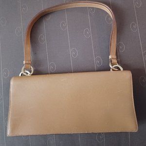 Gucci tan leather handbag. Top strap handle. Push lock closure at front. Single interior pocket. Nylon interior. Gold tone hardware. Shoulder strap drops 10 inches.