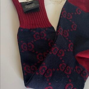 Stylish Gucci socks with iconic pattern. Burgundy and navy colors. Elevate your casual look.