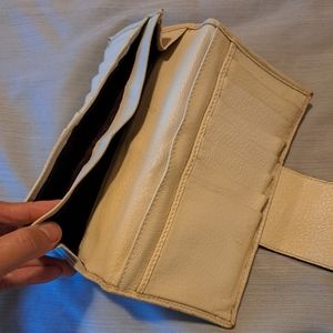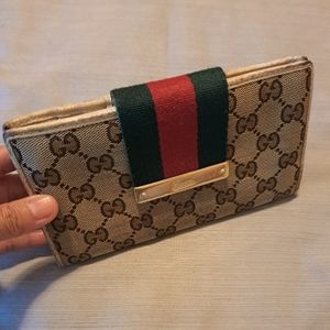 Gucci medium size wallet in brown beige monogram canvas with Sherry line green red stripe insignia, gold tone clasp with carved Gucci. white leather trim and interior. Has plenty of room: has 4 bills/notes compartment (1 is expandable), 14 card slots, and a zippered coin compartment at the back. Condition is preowned with signs of use: has dirt, has dirt, rubs, fading on corners, rubs on edges/ corners, has scratch on the metal, fading on leather. A bit out of shape. Snap doesn't close. Measures 7.1" x4". Pls. look at all photos as they are part of description. Open to offers.
