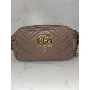 Chic cream leather GG shoulder bag by Gucci. Features gold accents and a stylish design. This bag is vintage therefore it does have wear. There is discoloration, there is some rubbing and a spot of exposed piping. Please see all photos for accurate description.