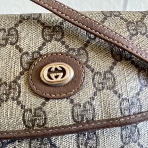 Exterior is made from PVC, features leather trims, leather strap with GG metal fittings, snap closure flap cover with the GG logo.
