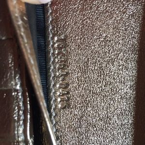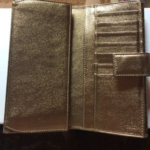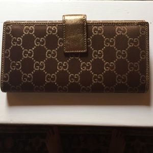 Hardly used bronze Gucci wallet with 4 large pockets and 8 small pockets on the inside.