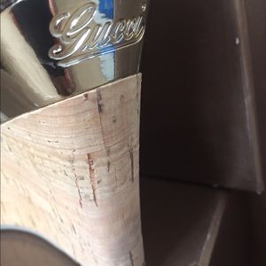 Guccissima pattern wedge peep toe sandals. Size 7. Comfy & stylish! Cork wedge with gold engraved hardware. Very nice! Box and dust bag included. Matching handbag available - see my closet for details.