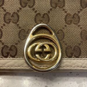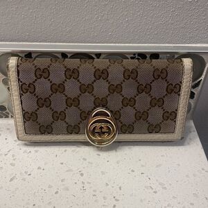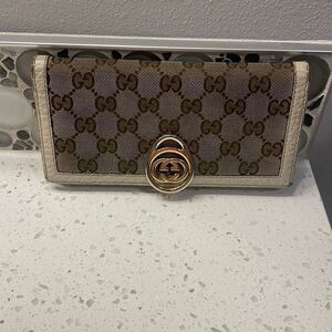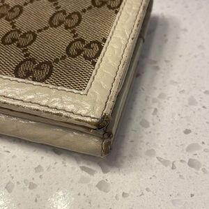 Gucci woman’s canvas and cream leather wallet. It is super cute but it does have a lot of wear and tear on it. Please see pictures for details.