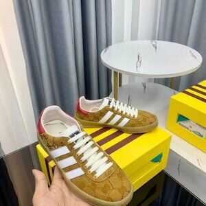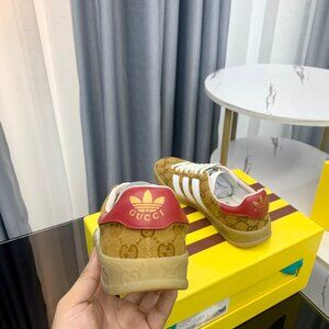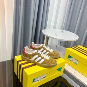 Stylish Gucci sneakers with tan and red accents. Features signature logo pattern. Comfortable and chic design.