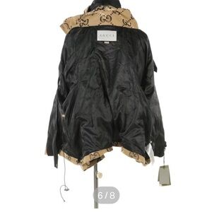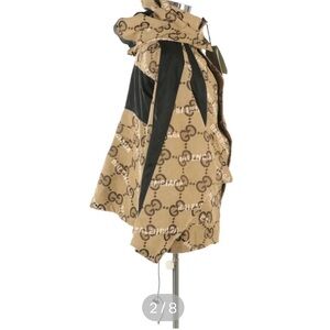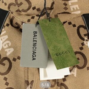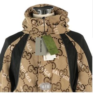 Stylish Balenciaga jacket with bold logo print. Features tan and black color scheme. Hooded design with front pockets.
