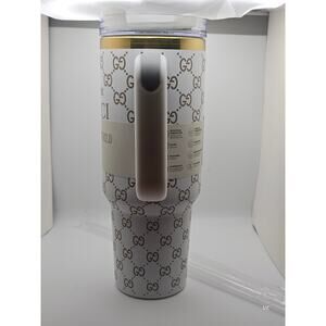 Limited Edition Gucci x Stanley Quencher H2.0 FlowState Tumbler in white and gold. Features a 40 oz capacity, double-wall insulation, and reusable straw. Keeps drinks cold, iced, or hot for hours. Stylish, durable, and perfect for everyday use or as a collectible piece for Gucci/Stanley fans.