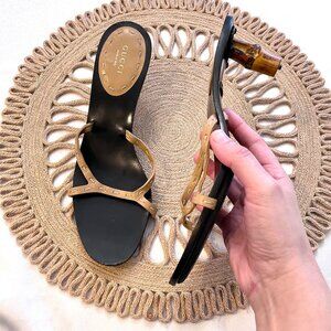Gucci x Tom Ford Collection Tan Black Leather Bamboo Open Toe Slide Heels Size 9