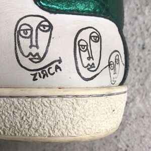 Please look at the pictures. These men sneakers have been customized, which I show in pictures. The shoes them selves are good, but have wear on the back of the heel n need minor cleanup. Men’s EU 38 and would easily fit a ladies 9 1/2