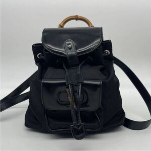 Iconic Gucci Bamboo Mini Backpack in classic black — a timeless blend of luxury and functionality. Crafted in durable nylon with smooth black leather trim and authentic bamboo handle & toggle closure. Perfect size for daily wear or travel with adjustable leather straps for comfort and a secure drawstring/flap closure.