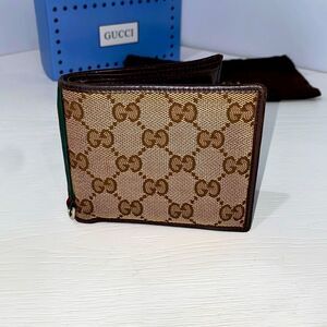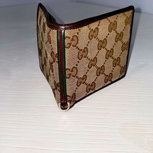 Gucci Bifold Brown Tan Canvas Iconic GG Monogram Leather Trim With Red Crease