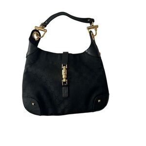 Elegant Gucci hobo bag in black. Features striking gold accents. Perfect for any occasion.