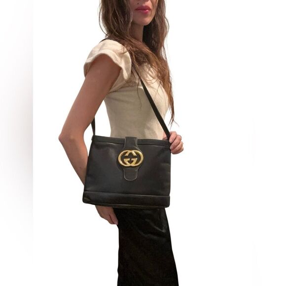 Chic Gucci shoulder bag in black leather. Features iconic gold logo detail. Stylish and versatile.