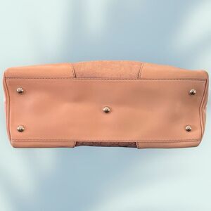 Metallic rose gold GG canvas Gucci Lovely Bowler bag with gold-tone hardware, tan leather trim, dual rolled top handles, heart GG logo adornment at front corner, protective feet at base, creme canvas lining, three interior pockets; one with zip closure and zip closure at top. Includes dust bag and care booklet. Buy handbags from Gucci at The RealReal.