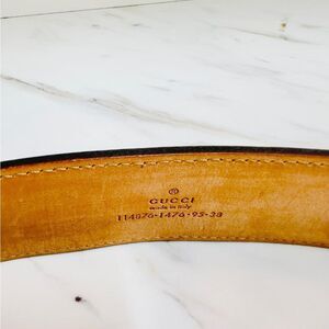 Elegant Gucci belt featuring a gold buckle. Brown patterned design adds sophistication.