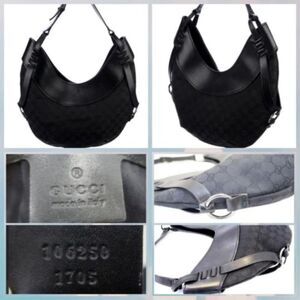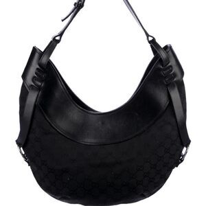 Gucci  Black GG monogram canvas hobo shoulder bag with silver-tone hardware, tonal leather trim, single flat shoulder strap, tonal canvas lining, single zip pocket. Includes certificate of authenticity. Serial # 106250 1705.