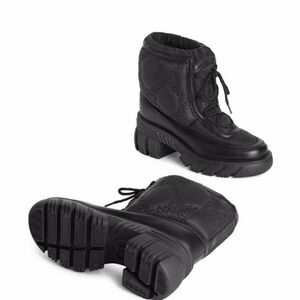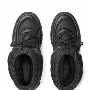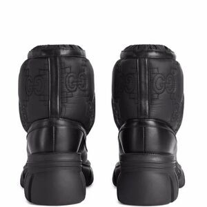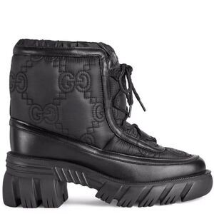 With a chunky rubber sole, these black tonal boots from Gucci are inspired by the outdoors. With a hiker-boot lace-up front, the ankle-length pair are finished with an embroidered monogram pattern.