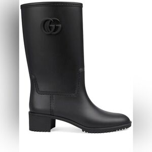 Double G leather boots from Gucci featuring black leather signature Double G logo round toe slip-on style and low block heel.