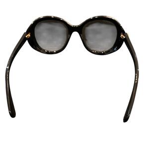 Round acetate sunglasses in black. Integrated nose pads. Grey lenses with 100% UV protection. Logo etched at lens. Gold-tone logo plaque at hinges. Gold-tone graphic printed at temple tips