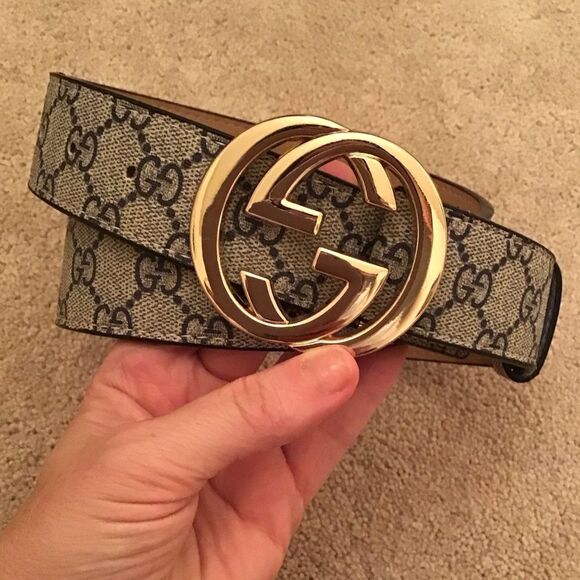 Stylish Gucci belt with iconic gold buckle. Features a sophisticated gray pattern. Perfect for any fashion-forward wardrobe.