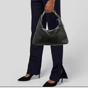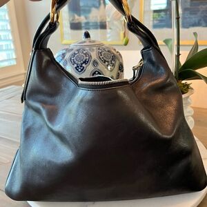 Black Gucci horsebit hobo featuring the signature gold hardware. These were designed when Tom Ford was with Gucci. It is a spectacular bag and in great condition. There are minor surface scratches and slight wear on one corner as shown in the pictures. The interior is spotless and minimal wear on gold hardware. Measurements are not including the handle on length. The drop of the handle from shoulder to top of bag is approx 7.5”. It comes with the original dust bag. This fits nicely under the arm and just a gorgeous handbag. I am selling to make room for another bag I purchased for myself. It is a vintage item so will show small signs of wear. Please see all pictures