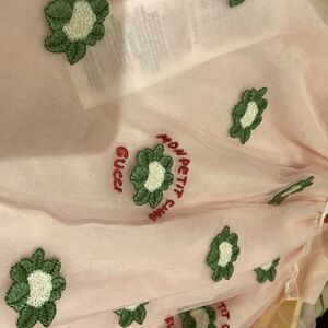 The French phrase 'Mon Petit Chou' literally translates to 'my little cauliflower'. Both the wording and an image of a cauliflower are embroidered on the tulle overlay of this short-sleeve dress, continuing the key element of playfulness in Gucci's children's collection.
