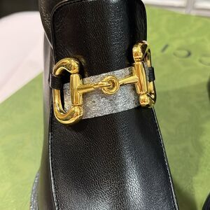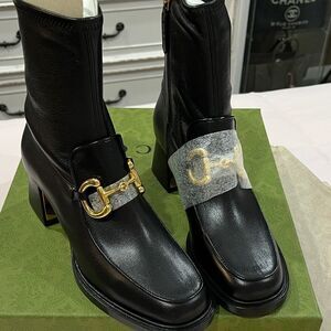 Black with gold hardware Gucci leather boots. They are stunning. Comes with box and two dust bags. The sipper says Gucci on tag. The ankle part is stretchy.