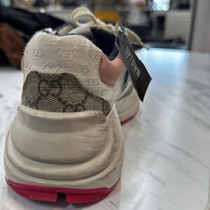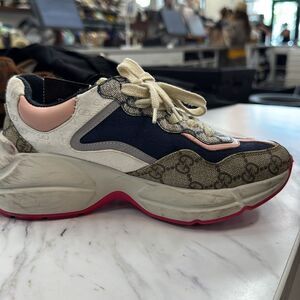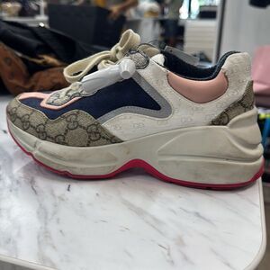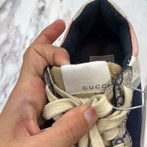 Elegant Gucci sneakers with a navy and cream monogram pattern. Ideal for everyday style.