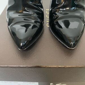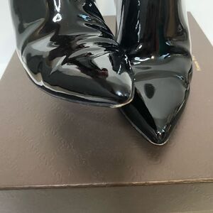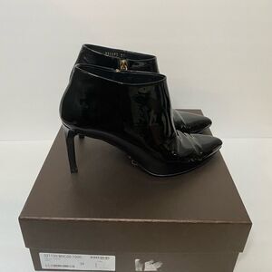 Gently worn Gucci Patent Leather Black Ankle Booties. Size 39. Shows some signs of wear on the heels (shown in pics). Comes with 2 new heel taps, Box and one large Dustbag.