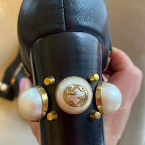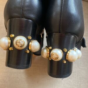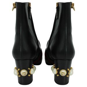 This is an authentic pair of GUCCI Betis Glamour Calfskin Web Pearl Embellished Peyton 75mm Ankle Boots size 35 in Black. These boots are crafted of smooth black calfskin leather. They feature an antique gold-toned double G, a blue and red web detail, stacked heel, square toe, and side zip closure.