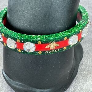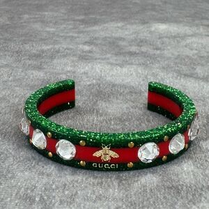 This fantastic Gucci cuff is great for any fashionista. This light-weight resin cuff bracelet features vintage web motif with goldtone studs and crystals. This new and modern take on a cuff is sure to turn heads. Retail price $550.